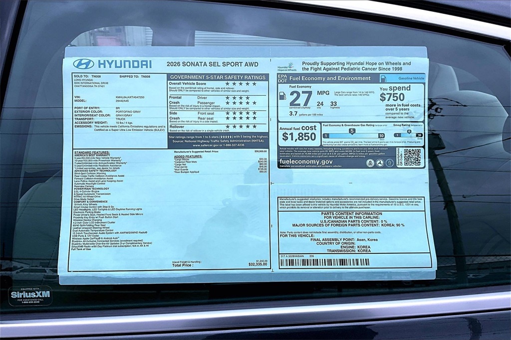 2026 Hyundai Sonata SEL Sport Portofino Gray Price includes: $1000 - Hyundai HMF Dealer Choice : $1000 discount. $44.09 per $1000 financed. Available to well qualified buyers who finance through Hyundai Motor Finance. H704. Exp. 01/02/2026