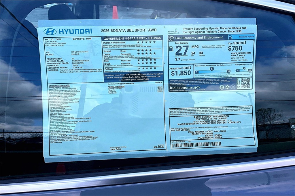 2026 Hyundai Sonata SEL Sport Transmission Blue Price includes: $1000 - Hyundai HMF Dealer Choice : $1000 discount. $44.09 per $1000 financed. Available to well qualified buyers who finance through Hyundai Motor Finance. H704. Exp. 01/02/2026